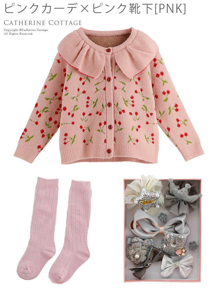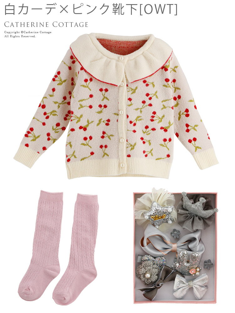 おしゃれでかわいいギフトセットなら、 選ぶ楽しみも、もらったときの喜びも! Color Detail - セット内容 - ▲大きめフリル襟がかわいいさくらんぼ柄のカーディガンは、 マシュマロのような柔らかな肌触りが自慢! しっかりと目が詰まっているので防寒昨日も◎ ▲コーデを選ばずカジュアルにもキレイめにもはける シンプルなソックスなら、何枚あっても嬉しい! ▲プレゼントみたいな箱をワクワク開けると、 中にはキラキラかわいいヘアピンがたくさん! ベビーだって毎日ヘアアレンジをかわいく楽しみたい! ▲オリジナルギフトボックス。